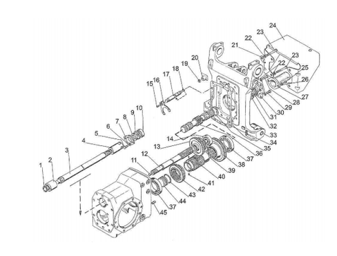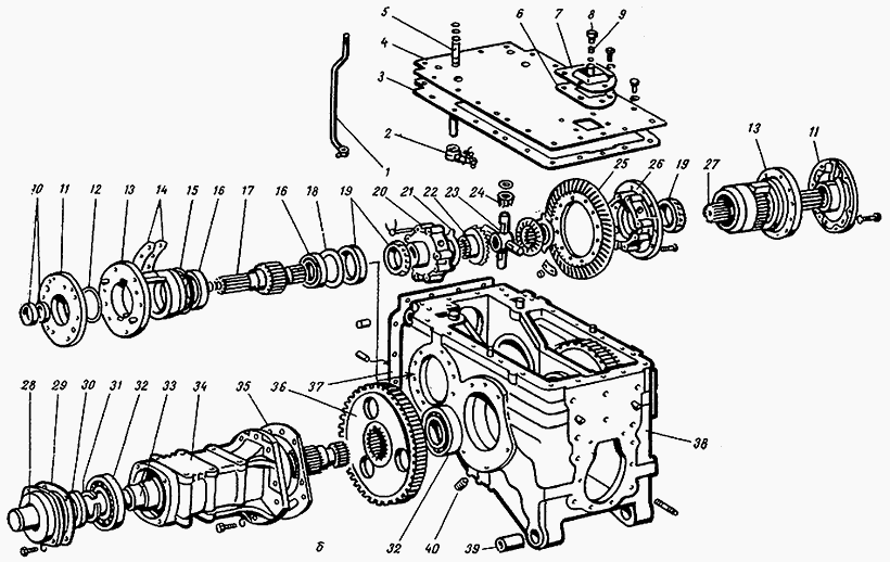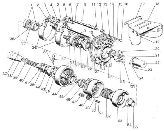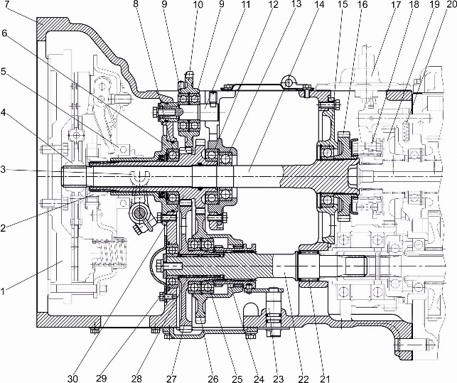 1 – Плита, 2 – Крышка ВОМ, 3 – Прокладка, 4 – Оси, 5 – Вал заднего ВОМ, 6 – Подшипники, 7 – Тормозные ленты с накладками, 8 – Подшипник, 9 – Втулка, 10 – Барабан, 11 – Солнечная шестерня, 12 – Водило, 13 – Сателлит, 14 – Ось сателлита, 15 – Подшипник, 16 – Шестерня коромысла, 17 – Стакан, 18 – Подшипник, 19 – Стопорные кольца, 20 – Вал, 21 – Муфта, 22 – Кожух ВОМ.