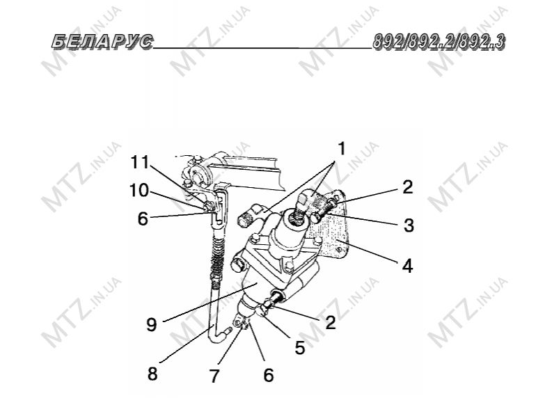 Отсоединяют тягу от рычага управления ВОМ, выворачивают болты 8 до свободного проворачивания хвостовика ВОМ усилием руки, подсоединяют тягу к рычагу управления, при необходимости вращением вилки изменяют ее длину и устанавливают механизм сервоусиления.
