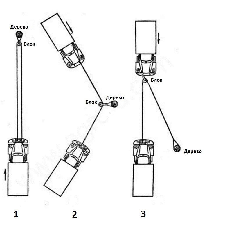 Конец троса обязательно закрепите непосредственно на автомобиле, если его закрепить на другом объекте, эффекта полиспаста не добиться.