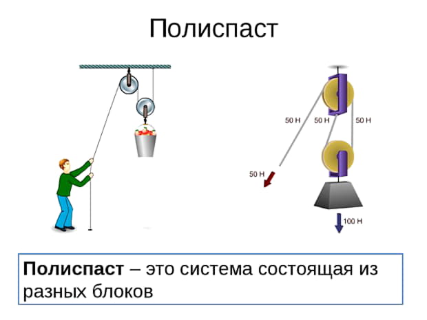 Полиспаст — это система блоков, в которой неподвижные и подвижные блоки соединены попарно и огибаются общей нитью (тросом, веревкой, цепью).