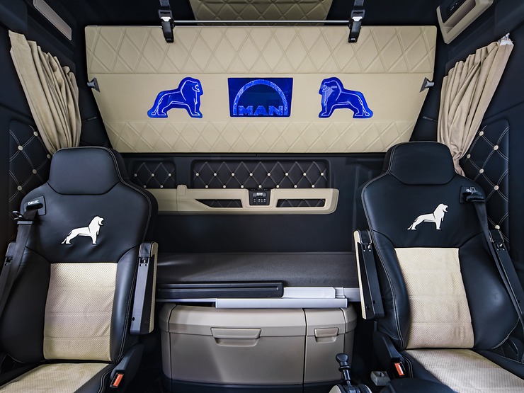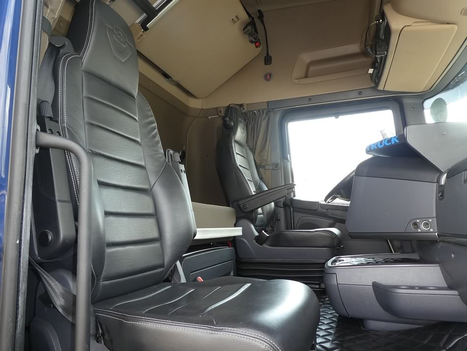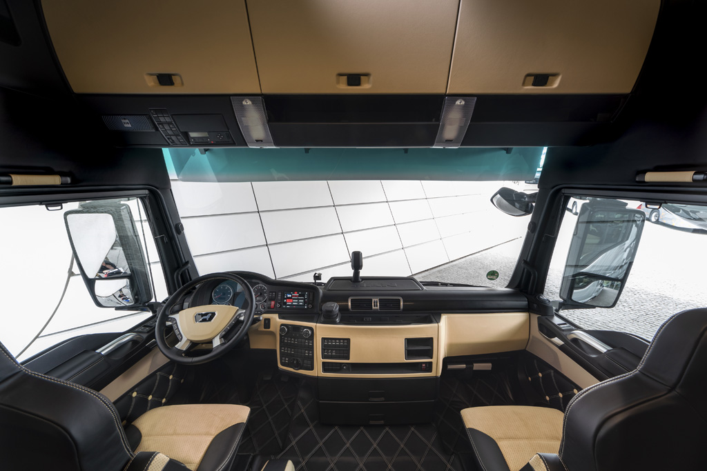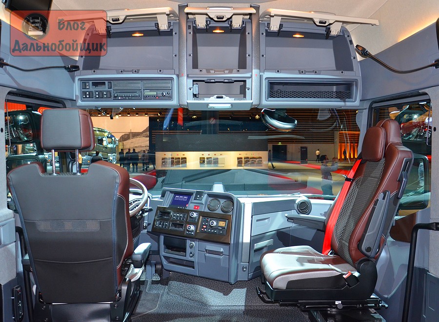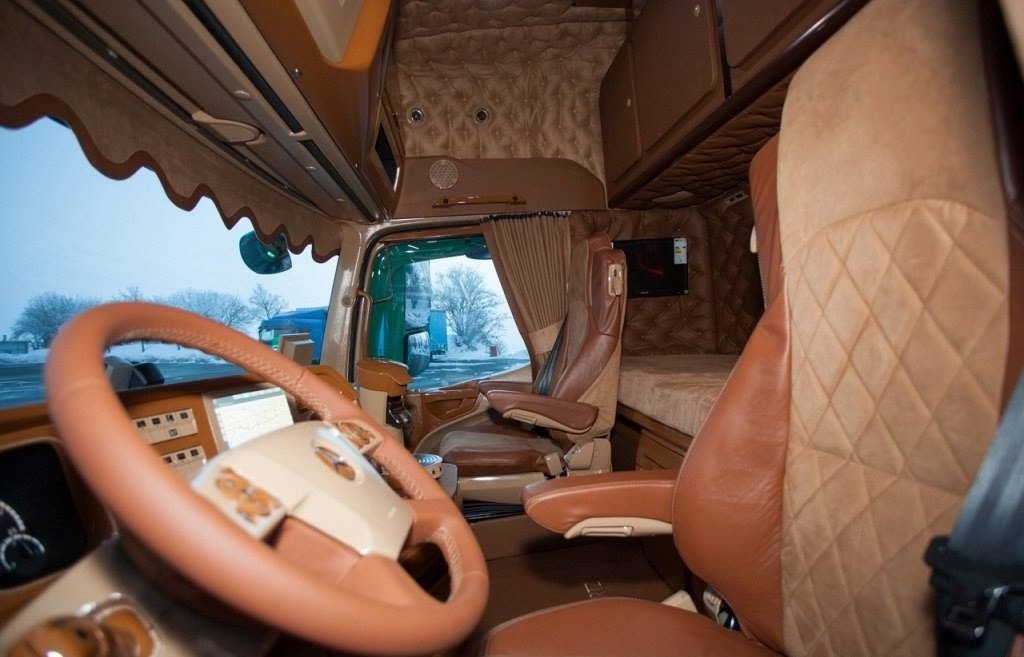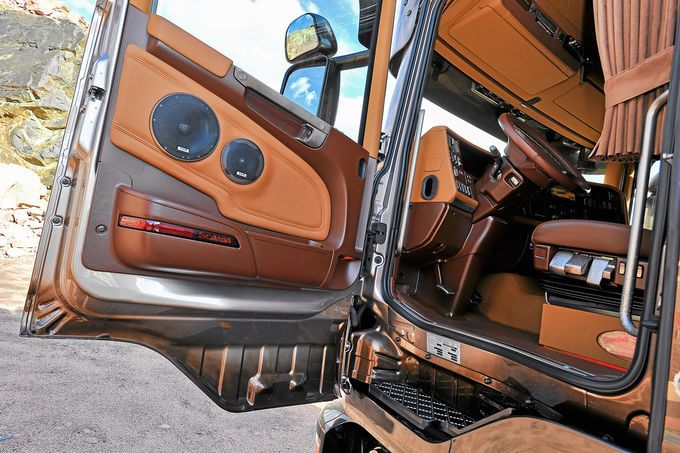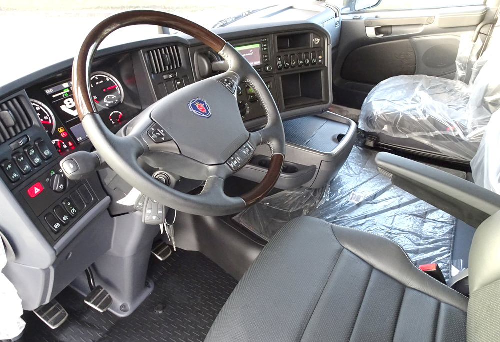 Самая большая кабина в линейке, кожаные кресла и все возможные опции, включая встроенную кофеварку и микроволновку. Для большинства наших водителей – непредставимая роскошь. Но самое интересное все же под кабиной: самый мощный 16.4-литровый двигатель Scania V8 выдает 730 л.с. мощности и 3 500 Нм крутящего момента. Разумеется, нашла свое место и автоматизированная трансмиссия ScaniaOpticruise.