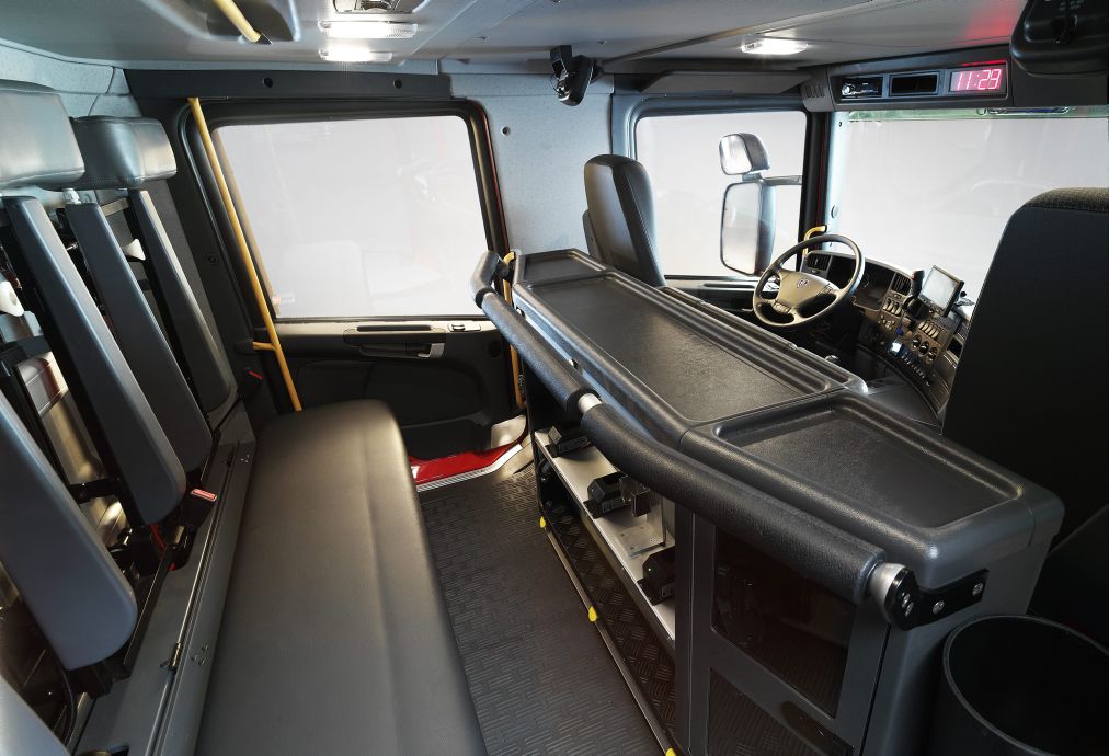 Максимальную маневренность обеспечивает рядный двигатель с 6 цилиндрами, объемом 13 л и мощностью 480 л. с. в комбинации с коробкой передач Allison и полным приводом. В двухрядной кабине Scania CP 28 хватит места для расчета из пяти (2+3) человек.