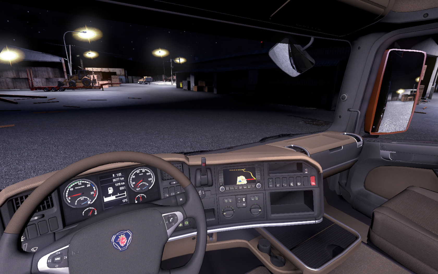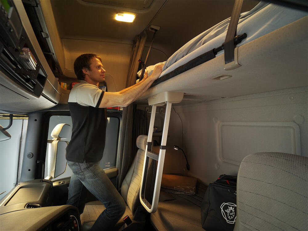 В общем, устраиваемся за рулем, запускаем двигатель обычным ключом (никаких кнопок) и снимаемся с обычного (не электрического) «ручника». Однако не стоит забывать, что в этом году Scania покажет новую кабину, где все это будет. Как будет и нормальное спальное место (зауженная в голове и ногах нижняя спальная полка – единственный, пожалуй, серьезный прокол в сканиевской эргономике).