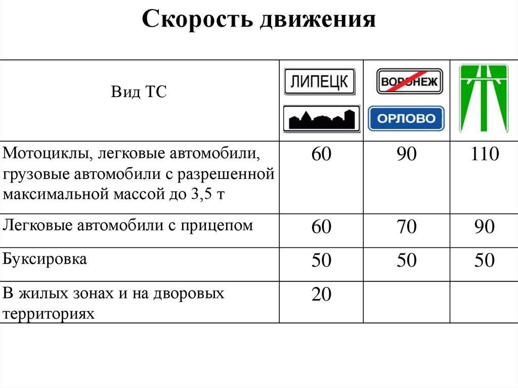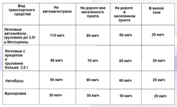 легковым автомобилям при буксировке прицепа, грузовым автомобилям с разрешенной максимальной массой более 3,5 т на автомагистралях — не более 90 км/ч, на остальных дорогах — не более 70 км/ч;