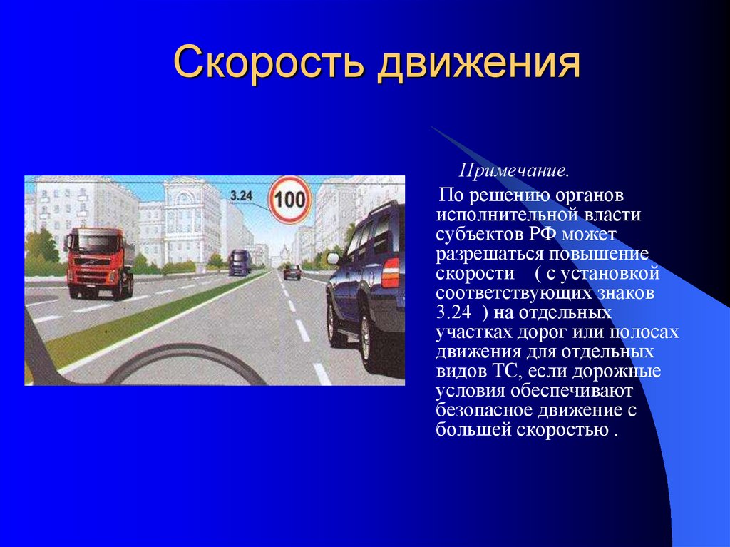 Примечание. По решению органов исполнительной власти субъектов Российской Федерации может разрешаться повышение скорости (с установкой соответствующих знаков) на участках дорог или полосах движения для отдельных видов транспортных средств, если дорожные условия обеспечивают безопасное движение с большей скоростью. В этом случае величина разрешенной скорости не должна превышать значения, установленные для соответствующих видов транспортных средств на автомагистралях.