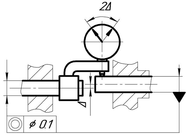 При измерении отклонения от соосности, проверяемая деталь, устанавливается между измерительными наконечниками, расположенными на оси оправок, одна из которых жестко закреплена в корпусе, а другая подпружинена в осевом направлении, при этом измерительные наконечники повернутся на некоторый угол. Это перемещение при помощи штанг будет передано на отсчетные устройства, закрепленные на оправках. При повороте детали на 360° определяют максимальные разности показаний, по которым судят о величине отклонения от соосности отверстий.