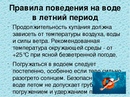 · Не следует выходить или прыгать в воду после длительного пребывания на солнце, так как при охлаждении в воде наступает сокращение мышц, что влечёт остановку сердца.