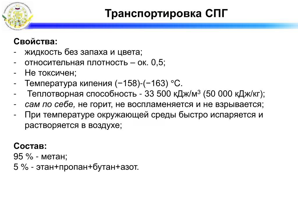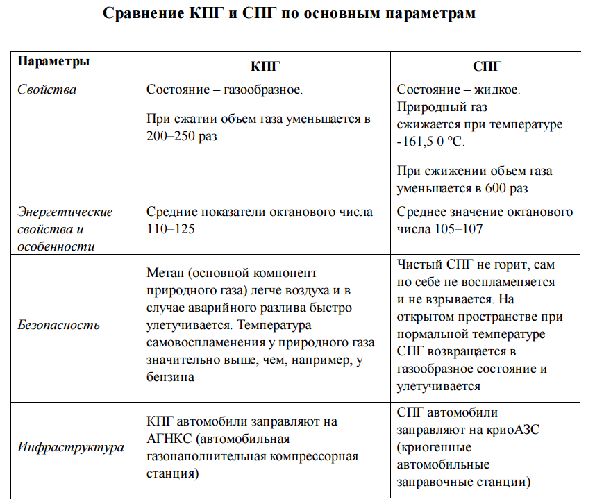 Из-за низкой температуры СПГ обычно не хранят под давлением. Это экологически чистое топливо с октановым числом 130.