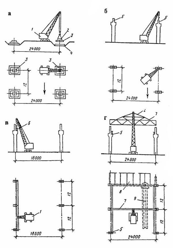Навигация: Основные принципы и способы монтажа строительных конструкций Основные принципы и способы монтажа строительных конструкций Монтажом строительных конструкций называется комплексный процесс механизированной сборки здания или сооружения из готовых элементов. В настоящее время в промышленном и гражданском строительстве применяется монтаж железобетонных, металлических и деревянных конструкций. Из всех этих конструкций наибольшее распространение имеют сборные железобетонные конструкции. Сборные конструкции зданий и сооружений должны монтироваться с соблюдением ряда основных принципов, соответствующих требованиям строительных норм и правил. Монтаж сборных конструкций следует производить преимущественно укрупненными элементами, соответствующими по массе грузоподъемности монтажных кранов, и непосредственно с транспортных средств или стендов укрупнения. При монтаже с приобъектного склада многоэтажных зданий сборные элементы доставляют на строительную площадку в комплекте на этаж и раскладывают в зоне действия монтажного крана. Не рекомендуется складывать конструкции и детали на крановых путях, а также между стенами сооружения и путями. При монтаже одноэтажных зданий сборные элементы доставляют на строительную площадку с учетом обеспечения бесперебойной работы и раскладывают непосредственно у места их установки в проектное положение. Монтаж сборных элементов осуществляется по принципу работы «на кран», т. е. наиболее удаленные от крана детали устанавливают в первую очередь. Стеновые панели и блоки многоэтажных зданий монтируют равномерно по периметру здания. Отставание монтажа по высоте допускается лишь в пределах одного этажа. После монтажа панелей перекрытия производят инструментальную проверку монтажного горизонта каждого этажа, разбивку ори-ентирных осей и разметку мест установки панелей в проектные положения. Способы монтажа конструкций. Монтаж зданий и сооружений из сборных элементов заключается в последовательном подъеме, установке и закреплении их в проектном положении. Способы монтажа могут быть различными и зависят от условий строительства, вида элементов (конструкций), мощности и наличия монтажных механизмов и машин. На выбор способов монтажа влияют общий объем конструкций и деталей, подлежащих монтажу, а также установленные сроки строительства. Любой способ монтажа должен обеспечивать устойчивость, неизменяемость и прочность смонтированных конструкций и всего сооружения в целом, максимально сжатые сроки монтажа, технически грамотное производство, работ, безопасность их выполнения и наиболее полное использование монтажных механизмов и машин. Выбор способа монтажа следует производить на основе сопоставления технико-экономических показателей различных вариантов комплексной механизации всех основных строительных и монтажных процессов. Рис. 180. Схема монтажа сборных элементов каркаса одноэтажного промышленного здания раздельным способом Различают три основных способа монтажа сборных‘кон-струкций: раздельный или дифференцированный, комплексный или сосредоточенный и смешанный или комбинированный. При раздельном способе монтажа сборные элементы в пределах захватки монтируют за несколько проходок крана. При” каждой проходке монтажного крана устанавливают 