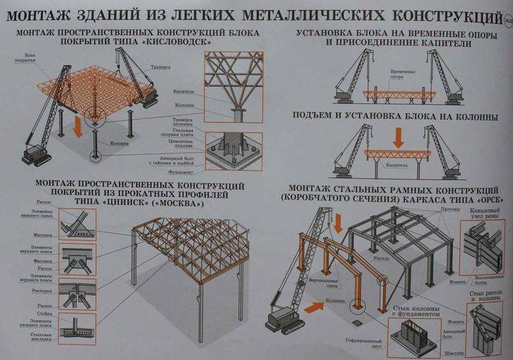При этом колонны и подкрановые балки монтируют обычно дифференцированным методом, а конструкции шатра покрытия — комплексным. При дифференцированном методе практически выше производительность труда и лучше точность установки конструкции, при комплексном — быстрее открывается фронт для последующих работ, сокращается количество единиц оснастки и сроки строительства.