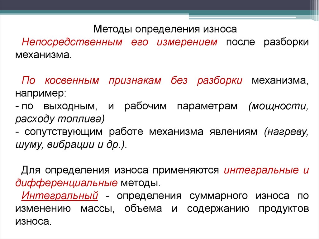 Величину износа можно определить способами, требующими разборки агрегата, и способами без разборки (интегральные способы). В первом случае величину износа определяют в разные периоды испытания, преимущественно в начале и конце испытания, при помощи контактных измерительных инструментов, взвешивания трущихся деталей, профилографов, отпечатков и лунок, наносимых на детали. Измерение износа при помощи профилографов основано на сопоставлении профилограмм, снятых с одного и того же участка исследуемой поверхности до износа и после него. Определение величины износа при помощи отпечатков заключается в измерении длины диагонали отпечатка, нанесенного при помощи алмазной пирамиды.