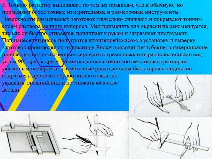 Характеристика работ. Разметка на полу, плите или на станке крупногабаритных и сложных деталей и узлов с пересечением осей и плоскостей, а также металлических моделей, отливок, поковок и металлоконструкций под обработку по 7 — 10 квалитетам с установкой заготовки, детали, узла на подкладках, клиньях, домкратах и на различных приспособлениях, с выверкой установки при помощи индикаторов, набора плоскопараллельных плиток и других контрольно-измерительных инструментов. Выполнение сложных разверточных чертежей, геометрических построений и тригонометрических вычислений для разметки и проверки заготовок, деталей и узлов. Выбор способа разметки деталей, узлов и проверка отливок.