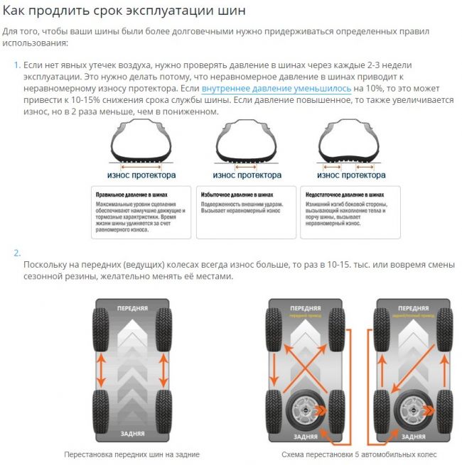 Производители шин заявляют, что шины можно использовать до шести лет, однако многие комплекты шин не доживают до этого рубежа. Это связано с износом шин и повреждением протектора, что сокращает срок службы шины.