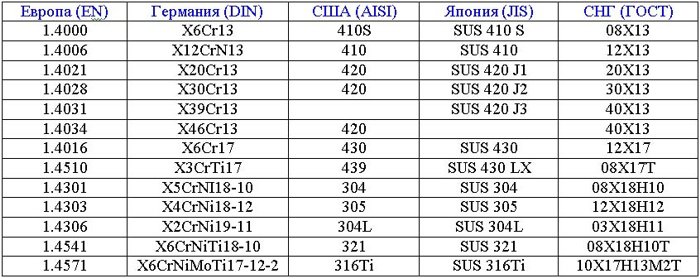 Сегодня существует более 250 марок нержавейки с разными характеристиками, с добавками хрома, никеля, титана и другими. Самыми известными марками нержавейки являются марки 300-й (содержат хрома 15 – 20 %) и 400-й (содержат хрома 11 – 17 %) серий.