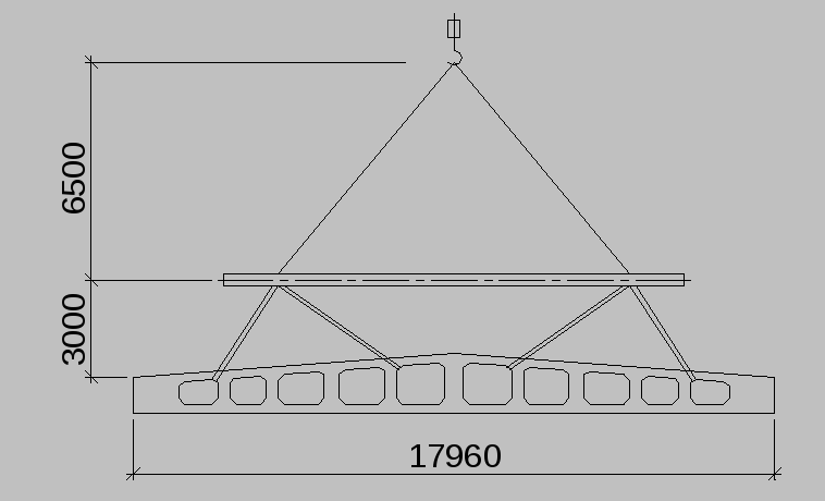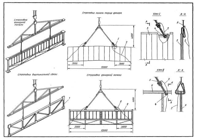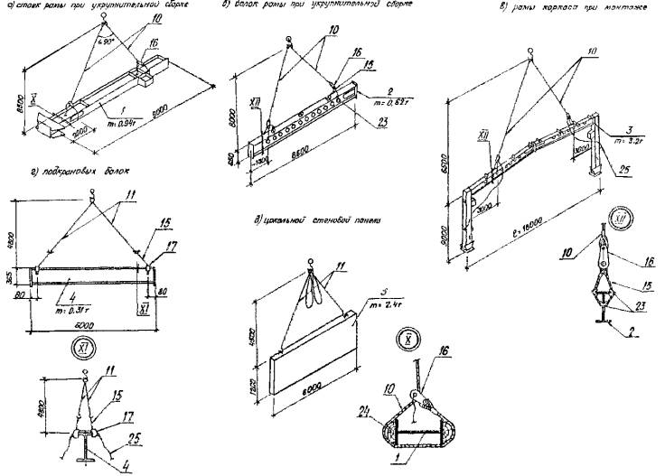 траверсой с четырьмя точками подвеса. Подъем тяжелых тонкостенных плит перекрытий производят шестиветвевым стропом.
