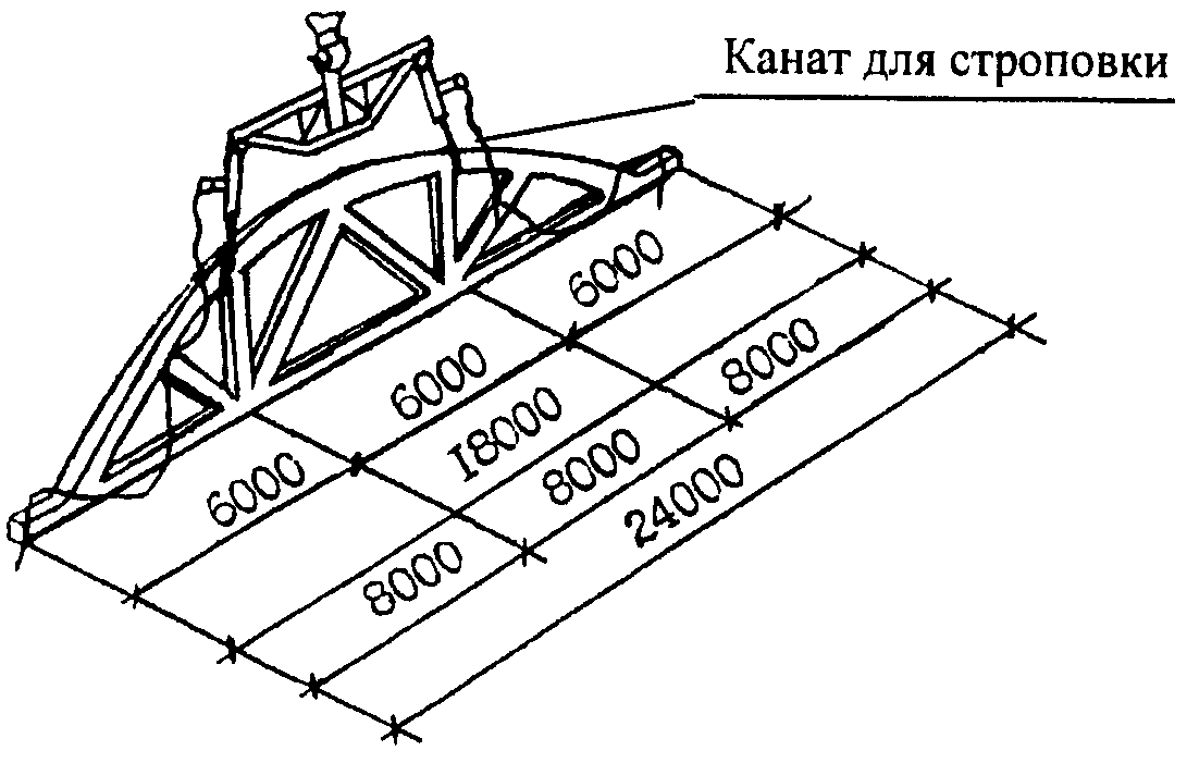 Строповку ферм в зависимости от пролета производят за две, три или четыре точки. Ферму захватывают в узлах верхнего пояса «в обхват» с