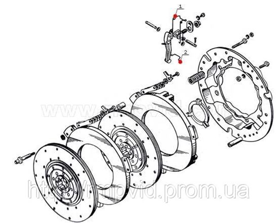 В случае зависания педали необходимо отпустить болты 4 и повернуть кронштейн 3 по часовой стрелке или завернуть регулировочный болт 2 на величину, обеспечивающую возврат педали в исходное положение. Если свободный ход педали сцепления не поддается регулировке путем изменения длины тяги 8, а ход рычага 5 при измерении на радиусе расположения пальца 6 менее 4 мм, произведите регулировку положения отжимных рычагов, как указано ниже.