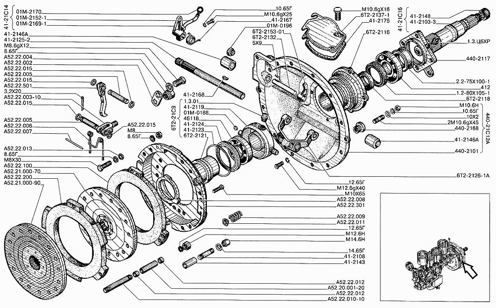 При необходимости на корзине сцепления А-41 А52.22.000-10 регулируют механизм блокировки путем изменения длины тяги, которая соединяет конец рычага (нижний) и рычажок валика в механизме блокировки коробки передач.