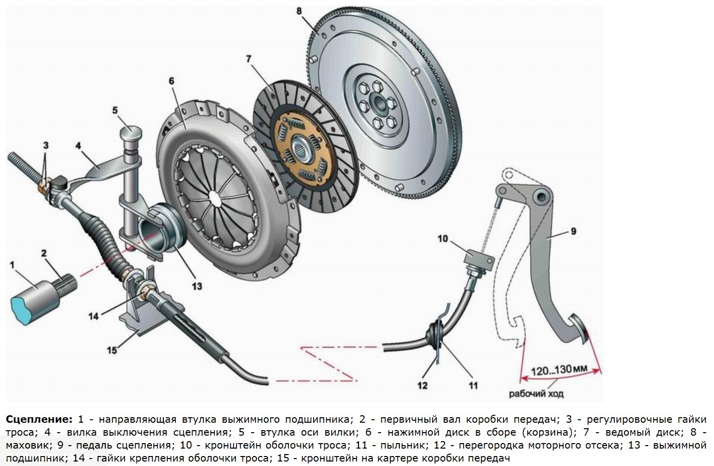 При нажатии на педаль сцепления трос перемещается внутри оболочки и перемещает рычаг вилки выключения сцепления, которая в дальнейшем воздействует на муфту выключения сцепления.