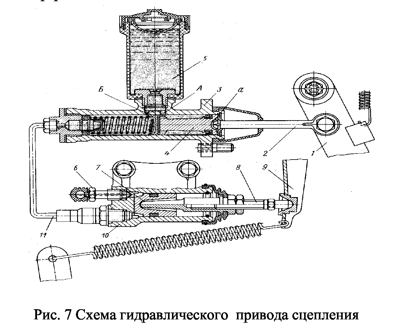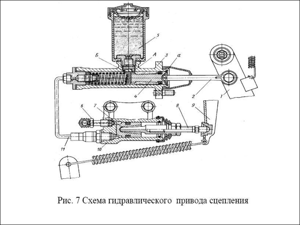 Гидравлический привод (рис. 2) состоит из педали 6 сцепления с оттяжной пружиной, главного цилиндра 3, соединенного трубкой 2 с бачком 1, рабочего цилиндра, трубопроводов и шлангов для подачи рабочей жидкости от главного цилиндра к рабочему цилиндру и вилки выключения сцепления с пружиной 11.