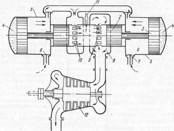 Кроме того, СПК может выполнять функцию генератора газов. В этом случае весь воздух, сжимаемый компрессором, направляется в свой двигатель для продувки высокого наддува. Выпускные газы, имеющие высокое давление и температуру, направляются в газовую турбину. Таким образом, в этом случае свободнопоршневой генератор газа (СПГГ) является составной частью газотурбинной установки.