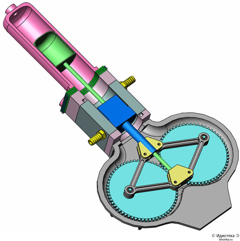 2. Сложность изготовления синхронизирующего механизма. (Но значительно дешевле и проще, чем 2 кривошипно-шатунных механизма и пр. детали)