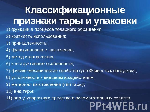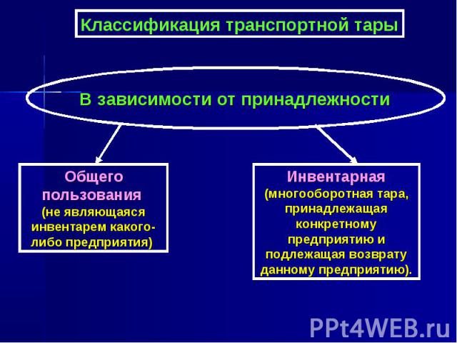 В зависимости от принадлежности следует различать тару общего и индивидуального пользования. Тара общего пользования может применяться различными предприятиями и организациями. К таре индивидуального пользования относится инвентарная тара, изготовляемая по специальному заказу для централизованной доставки товаров на розничные торговые предприятия. Она является собственностью предприятий промышленности или оптовых торговых предприятий. По кратности использования тара делится на многооборотную, возвратную и разового использования. Многооборотная тара предназначена для многократного ее использования при поставках продукции. Сюда относятся ящики, бочки, фляги, мешки и другая транспортная тара. К возвратной таре относится тара, бывшая в употреблении, которую целесообразно использовать повторно. Она подлежит сдаче поставщику в обязательном порядке. Разовая тара предназначена для однократного использования при поставках продукции. Это коробки из- под конфет, спичек, папирос и другая потребительская, а также транспортная тара, которая после ее использования подлежит утилизации.