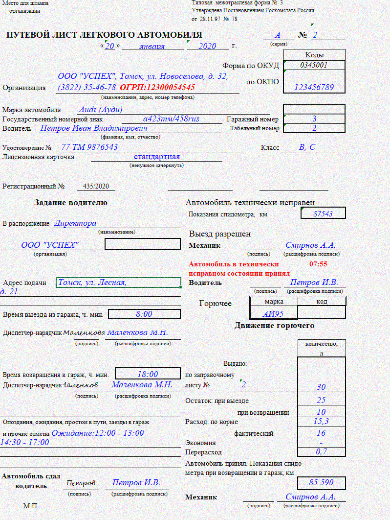 - Данные транспортного средства.