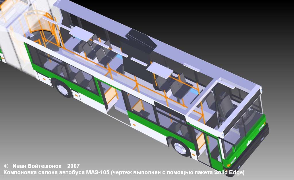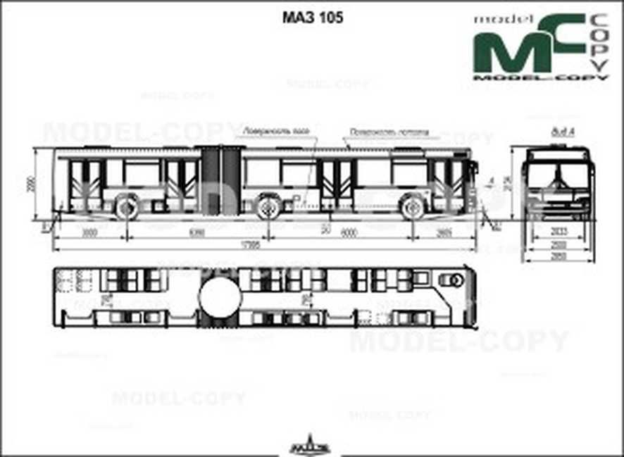С 1997 года на Минском автомобильном заводе (Беларусь) начат выпуск новой модели МАЗ 105. Это автобус, имеющий в средней части мягкое сочленение в виде гармошки. Достаточная вместимость обеспечивается добавочной задней секцией. Длина автобуса – 17,98 м, ширина – 2,5 м, высота – 3,13 м. За счет того, что автомобиль имеет большую вместительность, он является практически идеальным решением для городов, имеющих большие пассажиропотоки.