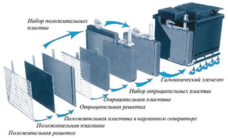 В результате образуется гальванический элемент с напряжением около 2 В. При разряде такого элемента в нем происходит обратный химический процесс: химическая энергия превращается в электрическую. Под влиянием разрядного тока из электролита выделяются кислород и водород.