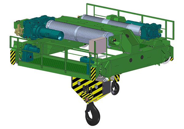 Крановая тележка г/п 12.5 т., в/п 12.0 м. Vпод.=10.0 м/мин., Vпер.=38.0 м/мин. Колея 2000мм. Температура эксплуатации : -40+40°С. Ограничитель грузоподъемности. Концевой выключатель хода тележки. Режим работы по ISO 4301 M5. Дополнительный тормоз на механизм подъема.