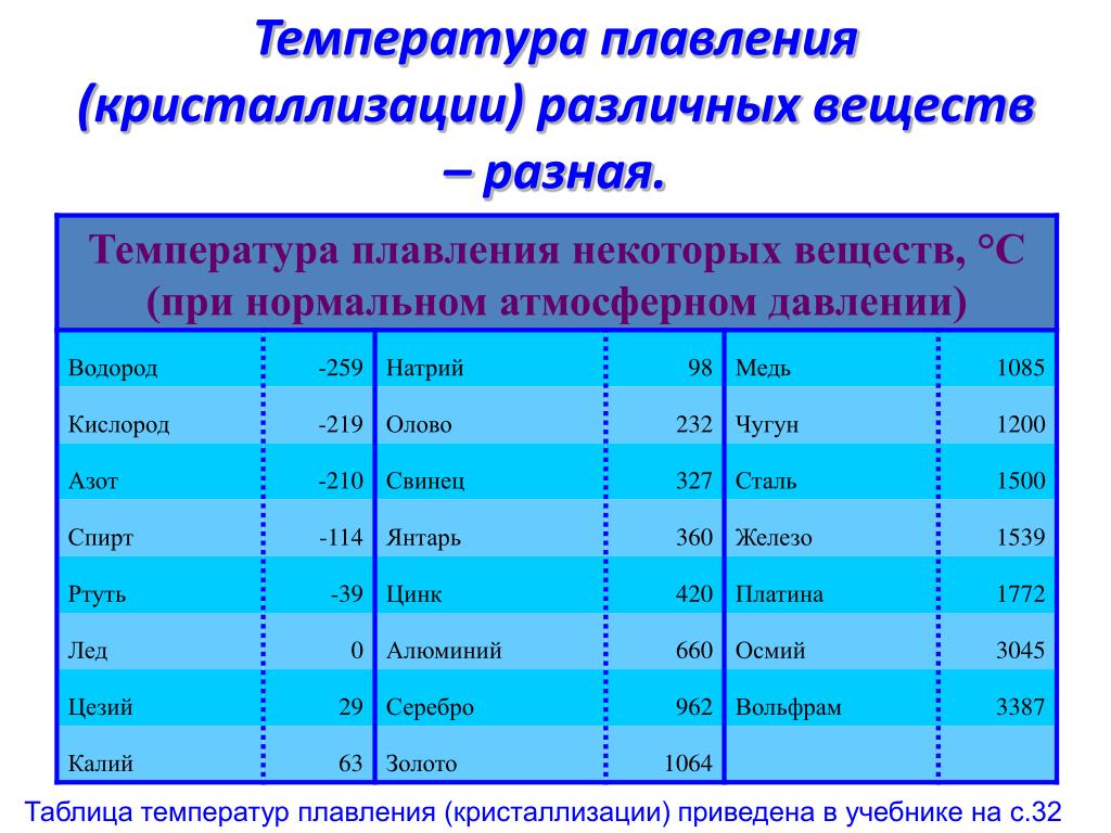 Обратите внимание, что эти точки связаны со стандартным атмосферным давлением. В целом плавление является фазовым переходом вещества из твердой фазы в жидкую. точка плавления вещества — это температура, при которой происходит это фазовое превращение. Точка плавления также определяет состояние, при котором твердое тело и жидкость могут существовать в равновесии. Для различных химических соединений и сплавов трудно определить температуру плавления, так как они обычно представляют собой смесь различных химических элементов.