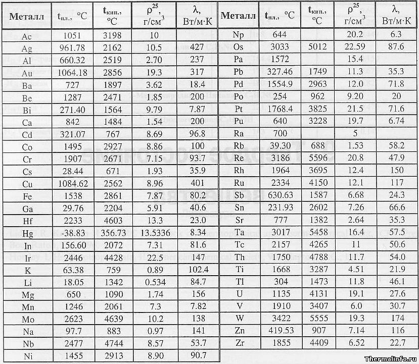 Температура плавления металлов, а также их плотность и теплопроводность приведены в таблице для следующих металлов: актиний Ac, серебро Ag, алюминий Al, золото Au, барий Ba, берилий Be, висмут Bi, кальций Ca, кадмий Cd, кобальт Co, хром Cr, цезий Cs, медь Cu, железо Fe, галлий Ga, гафний Hf, ртуть Hg, индий In, иридий Ir, калий K, литий Li, магний Mg, марганец Mn, молибден Mo, натрий Na, ниобий Nb, никель Ni, нептуний Np, осмий Os, протактиний Pa, свинец Pb, палладий Pd, полоний Po, платина Pt, плутоний Pu, радий Ra, рубидий Pb, рений Re, родий Rh, рутений Ru, сурьма Sb, олово Sn, стронций Sr, тантал Ta, технеций Tc, торий Th, титан Ti, таллий Tl, уран U, ванадий V, вольфрам W, цинк Zn, цирконий Zr.