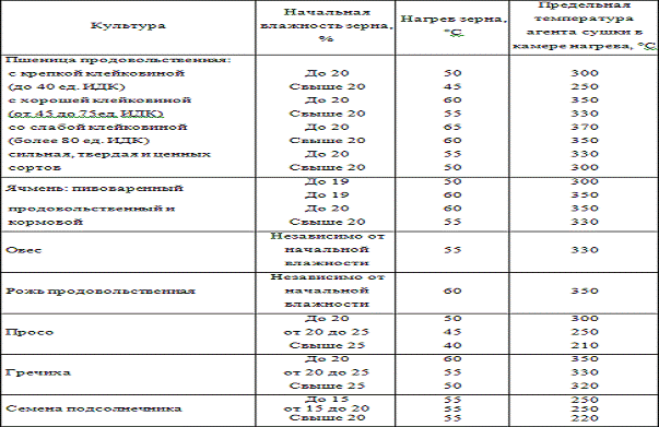 Аналогичные требования предъявляются к работе зерносушилок с другими сельскохозяйственными зерновыми культурами. Распад белка в пшенице начинается при 60 °С, следовательно, для нее температура нагрева зерна при сушке не должна превышать 55 °С. Для недозрелой пшеницы – не более 40 °С. Для свежесобранных злаков с влажностью более 25 % рекомендуется не повышать температурный режим, а проводить двукратную просушку.
