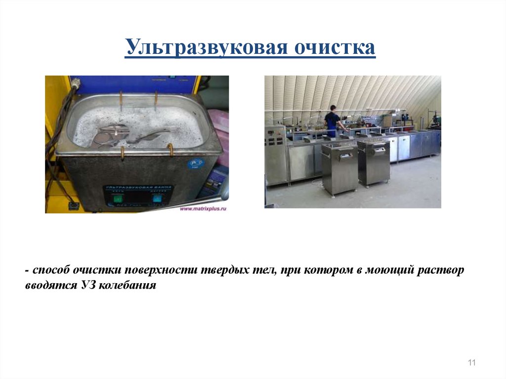Очистка Выбор химических веществ чрезвычайно важен для общего успеха процесса ультразвуковой очистки. Выбранный химикат должен быть совместим с очищаемым основным металлом и обладать способностью удалять присутствующие загрязнения.