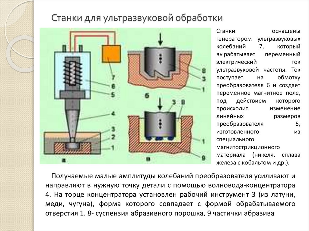 Переменная электрическая энергия ультразвукового генератора сначала преобразуется в переменное магнитное поле с помощью катушки с проволокой. Затем переменное магнитное поле используется для возбуждения механических колебаний ультразвуковой частоты в резонансных полосках из никеля или другого магнитострикционного материала, которые прикрепляются к поверхности, подлежащей вибрации.