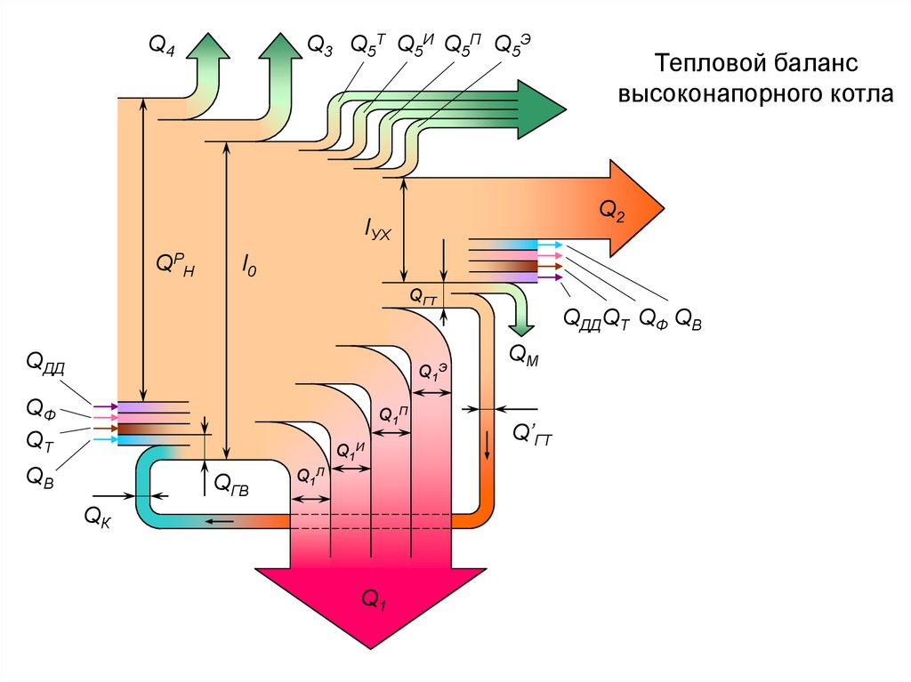 qн.б — невязка баланса, равная сумме остальных неучтенных потерь. Слагаемые уравнения теплового баланса равны: