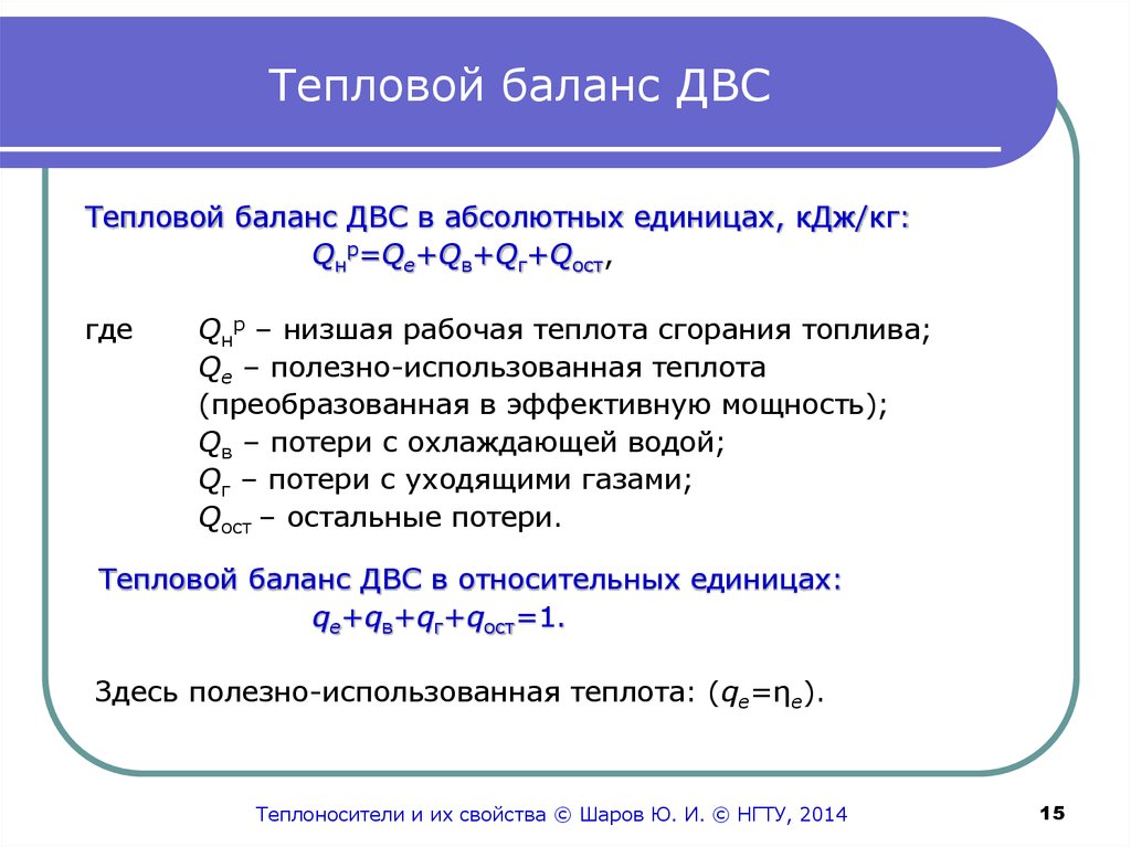Количество тепла, эквивалентное работе трения движущихся деталей двигателя, передается охлаждающей воде, циркулирующей в полостях охлаждения и в маслохолодильнике, а потому отдельно не учитывается.