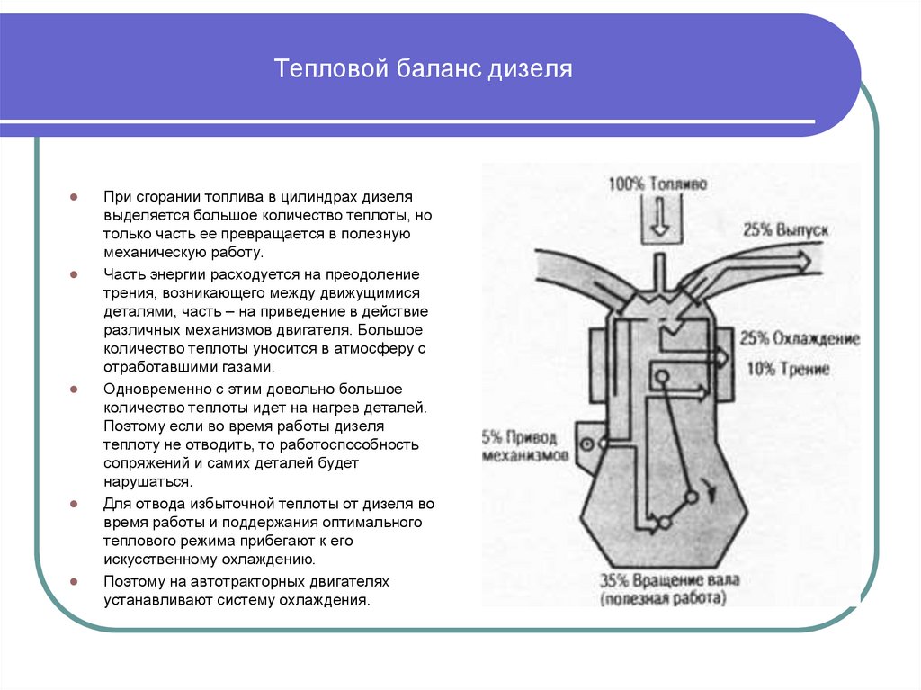 Как это следует из рассмотрения рабочего цикла двигателя, тепло, выделяющееся при сгорании топлива, не все переходит в полезную механическую работу — часть тепла уносится с охлаждающей водой, с отработавшими газами, а также незначительная часть тепла теряется от неполноты сгорания топлива в окружающую среду и переходит в тепло, эквивалентное кинетической энергии выпускных газов (если она не используется).