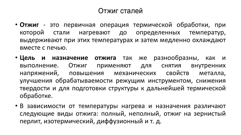- Отжиг — термическая обработка (термообработка) металла, при которой производится нагревание металла, а затем медленное охлаждение. Эта термобработка (т.е. отжиг) бывает разных видов (вид отжига зависит от температуры нагрева, скорости охлаждения металла).