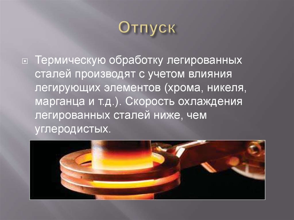 В зависимости от элементов, легированных сталью, можно получить различные полезные свойства. Отпуск — это процесс термической обработки, который служит для дальнейшего улучшения полезных свойств таких сплавов, в частности, за счет увеличения прочности. Обычно он используется после других процессов термообработки, которые повышают твердость, но делают металл хрупким. Эта термообработка чрезвычайно важна для изготовления деталей, которые должны выдерживать постоянные или повторяющиеся высокие нагрузки.