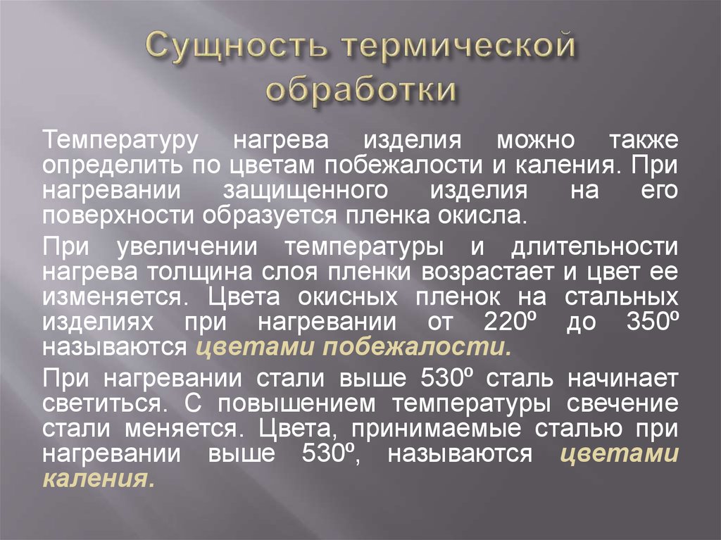 Для определения температуры при отпуске изделия пользуются таблицей цветов побежалости. Тонкая пленка окисдов железа, придающая металлу различные быстро меняющиеся цвета — от светло-желтого до серого. Такая пленка появляется, если очищенное от окалины стальное изделие нагреть до 220°C; при увеличении времени нагрева или повышении температуры окисная пленка утолщается и цвет ее изменяется.