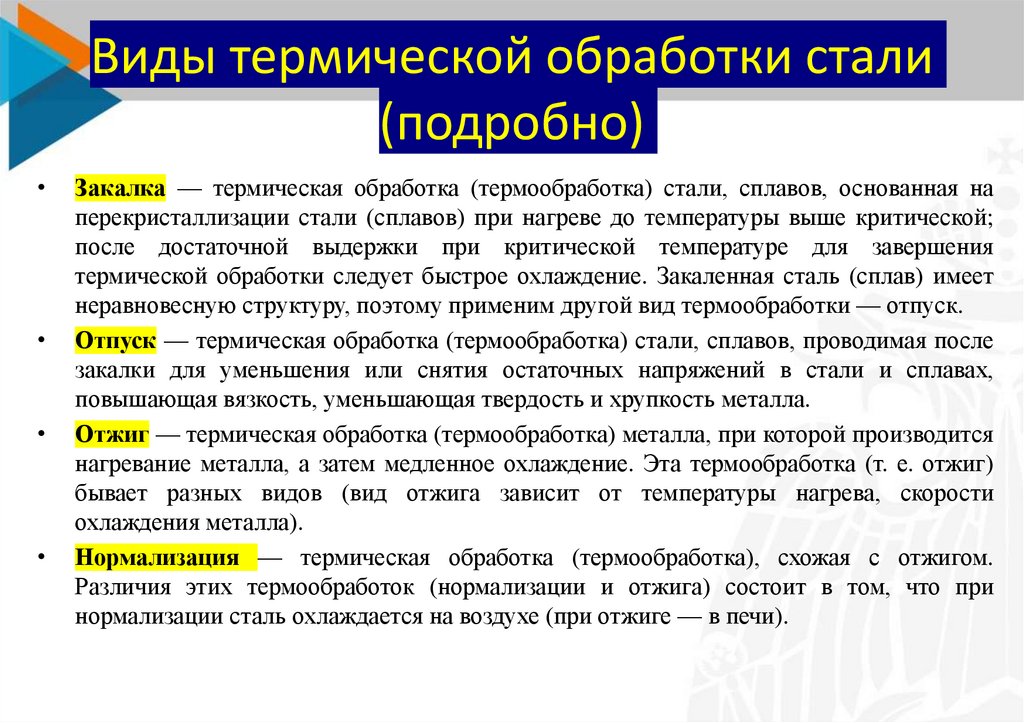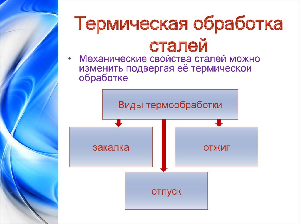 Термическая обработка (термообработка) стали, сплавов бывает следующих видов: отжиг, нормализация, закалка, отпуск.