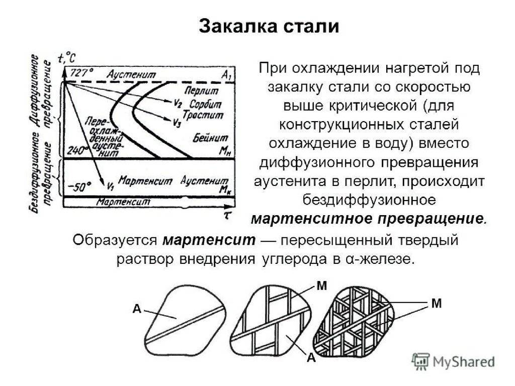 При закалке для переохлаждения аустенита до температуры мартенситного превращения требуется быстрое охлаждение, но не во всём интервале температур, а только в пределах 650-400 °C, то есть в том интервале температур в котором аустенит менее всего устойчив, быстрее всего превращается в феритно-цементитную смесь.