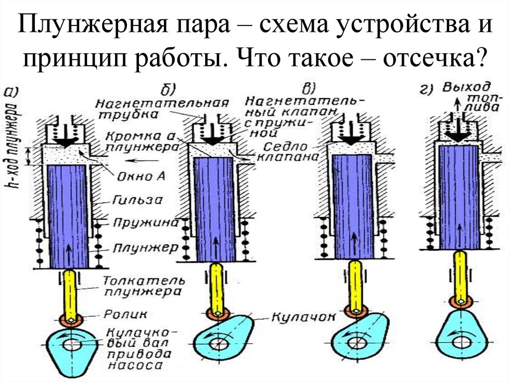 Поступательное движение обеспечивается кулачковой шайбой, а вращательное – валом топливного насоса.