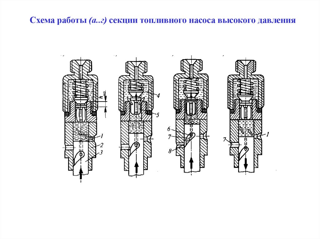 При этом открывается впускное отверстие 9, и топливо поступает в надплунжерное пространство 8. Затем под действием кулачка плунжер начинает подниматься вверх, перепуская топливо обратно в подводящий канал 10 до тех пор, пока верхняя кромка плунжера 1 не перекроет впускное отверстие 9 гильзы.