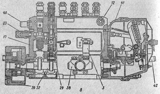Топливный насос высокого давления в сборе с муфтой опережения впрыскивания, регулятором частоты вращения и топливоподкачивающим насосом изображен на рис. 22. Кулачковый вал насоса вращается в роликовых конических подшипниках и промежуточной опоре.