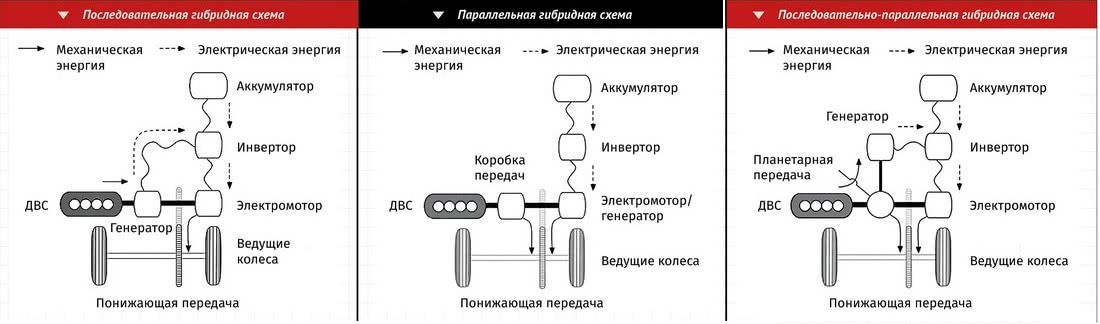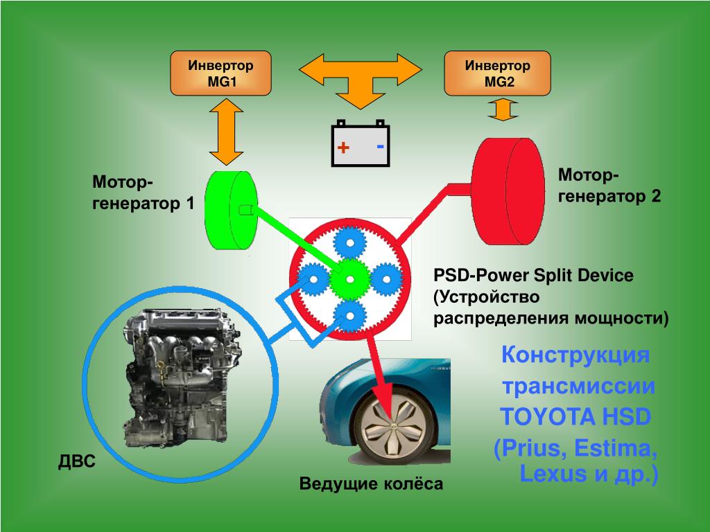 Предлагаемая в полезной модели конструктивная схема позволяет на некоторых режимах движения транспортного средства отключать ДВС и тем самым полностью исключить выброс вредных веществ с отработанными газами.