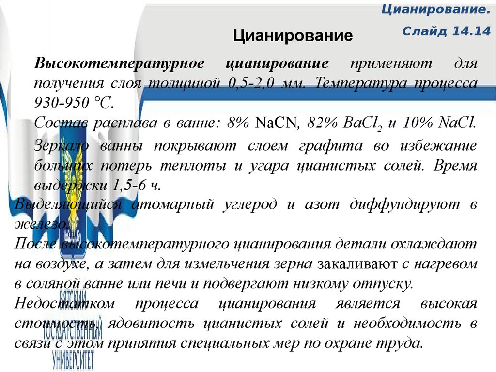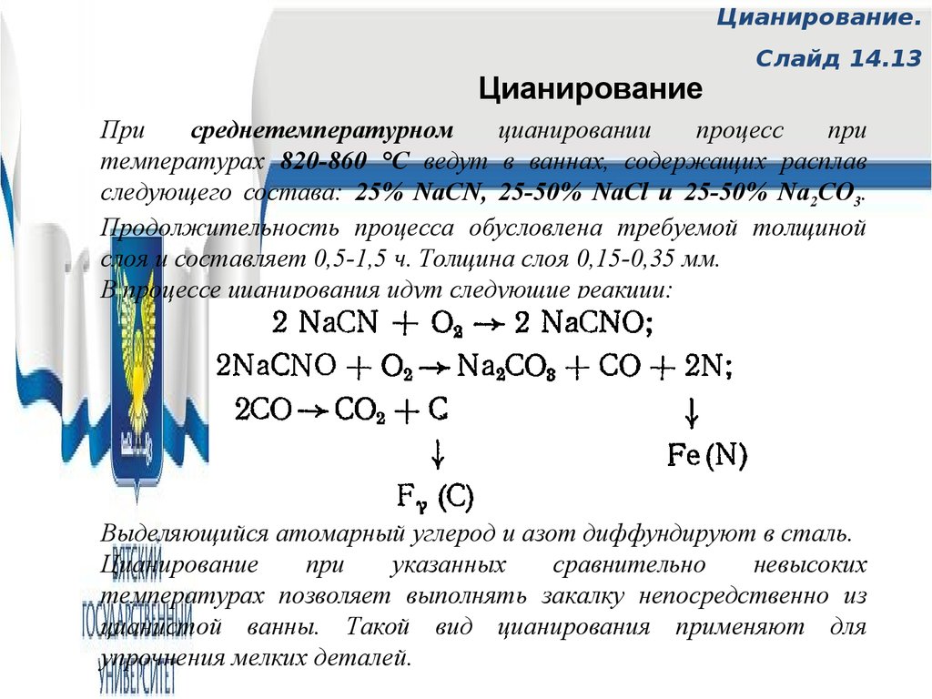 Низкотемпературное цианирование деталей из конструкционных сталей, называемое также «мягким азотированием», проводят при 560—580° С в цианистых ваннах, содержащих до 60% NaCN.