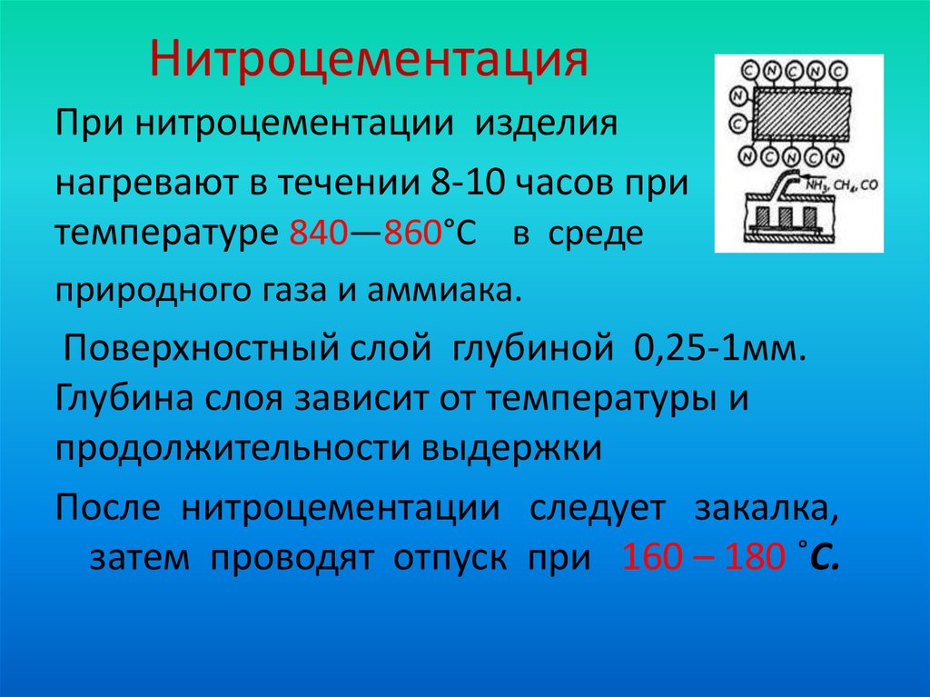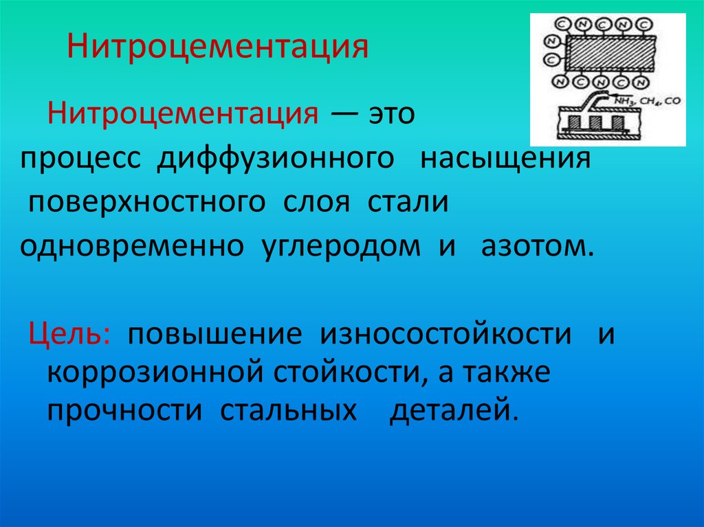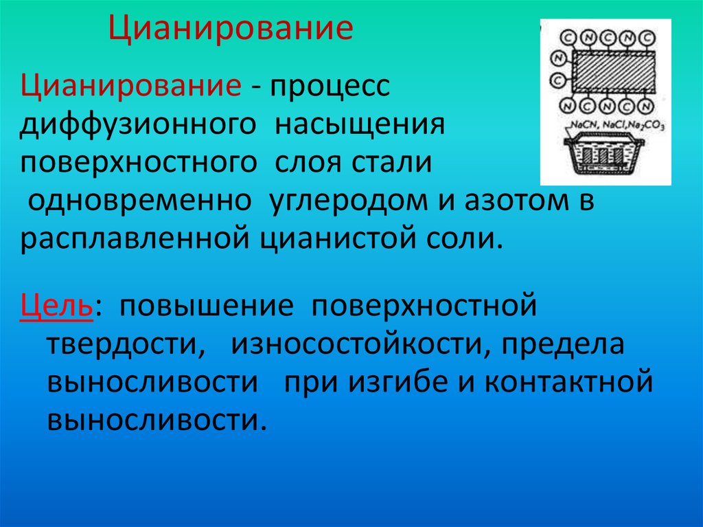 Процедурой цианирования называют насыщение поверхности разных металлических сплавов одновременно углеродом и азотом.